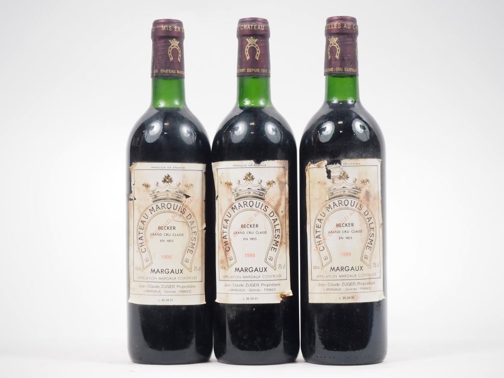 Lot de 3 BOUTEILLES CHÂTEAU MARQUIS D'ALESME GCC MARGAUX - 1995 - 2 BG/ET au prix de 40 à 60 € en vente aux enchères par l'hôtel des ventes Primardeco