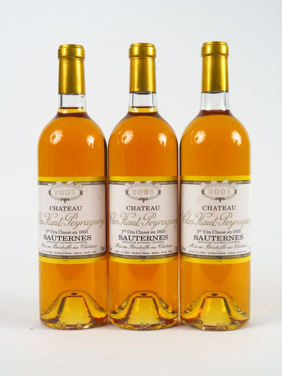 Lot de 3 BOUTEILLES CLOS HAUT PEYRAGUEY 1er CC SAUTERNES - 2003 - BG+ au prix de 30 à 40 € en vente aux enchères par l'hôtel des ventes Primardeco