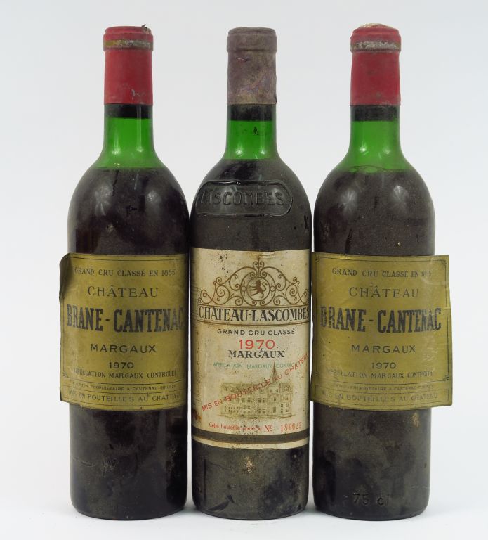 3 BOUTEILLES de 1970 : 1 CHÂTEAU LASCOMBES GCC MARGAUX LB/BS - 2 CHÂTEAU BRANE CANTENAC GCC MARGAUX HEP/BS/ELA/1 CAPS CORRODEE