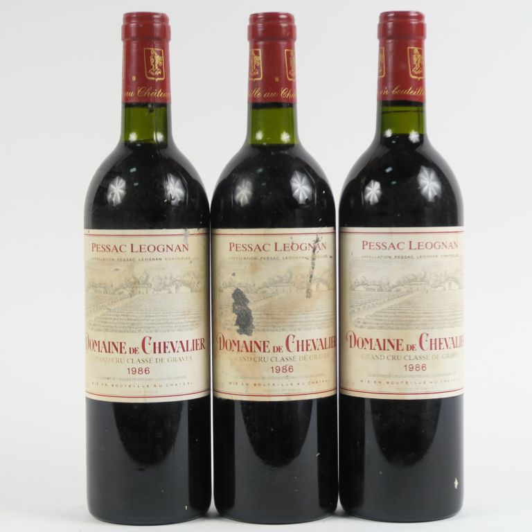 Lot de 3 BOUTEILLES DOMAINE DE CHEVALIER GCC GRAVES - 1986 - BG au prix de 100 à 120 € en vente aux enchères par l'hôtel des ventes Primardeco