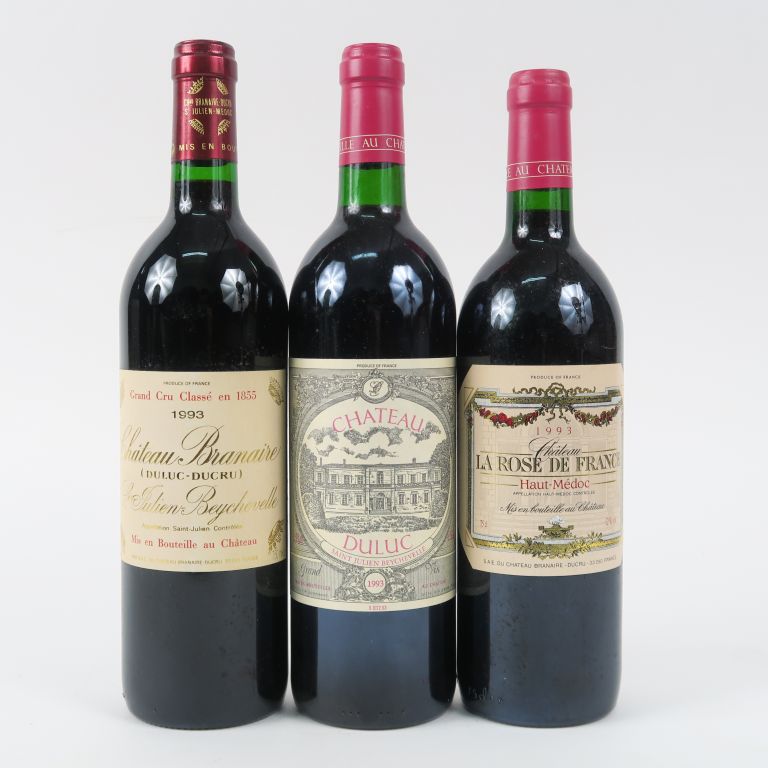 3 BOUTEILLES DU CHÂTEAU BRANAIRE 1993 - COFFRET : 1 CHÂTEAU BRANAIRE GCC - 1 CHÂTEAU DULUC - 1 CHÂTEAU LA ROSE DE France