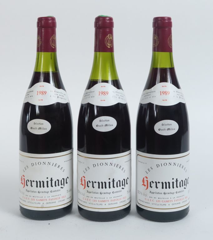 3 BOUTEILLES HERMITAGE 'LES DIONNIERES' FAYOLLE - 1989 - 1 à 2,5 CM/1 à 3 CM/1 à 3,5 CM