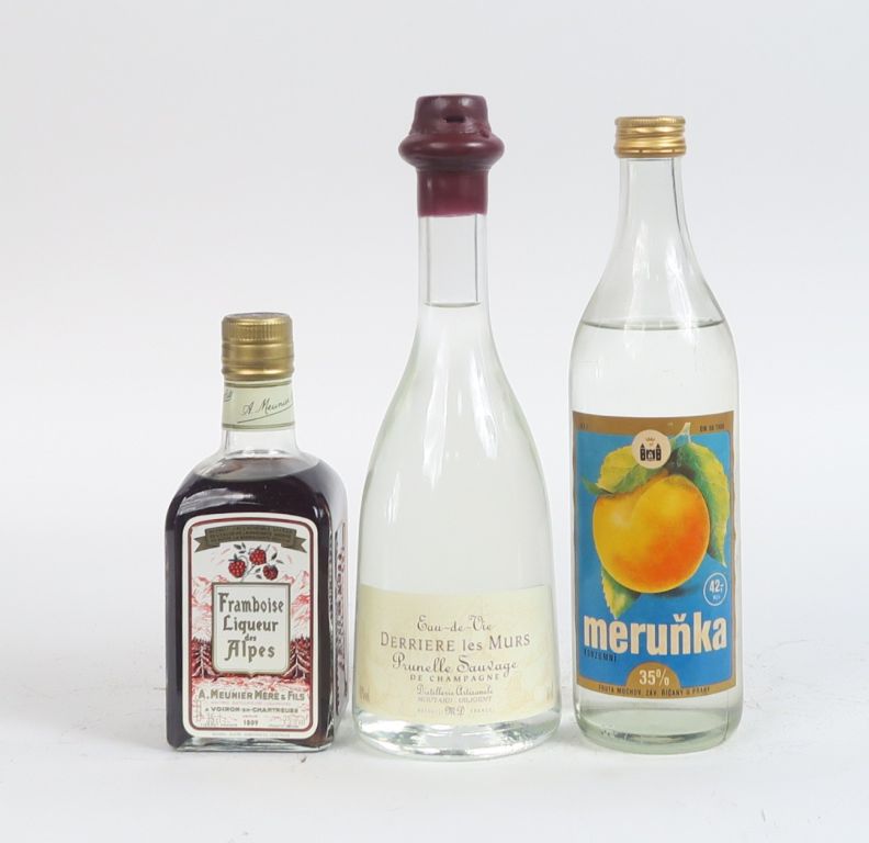 3 FLACONS : 1 LIQUEUR DE FRAMBOISE 35 CL - 1 EAU DE VIE PRUNELLE SAUVAGE 50 CL - 1 LIQUEUR DE PECHE 42 CL