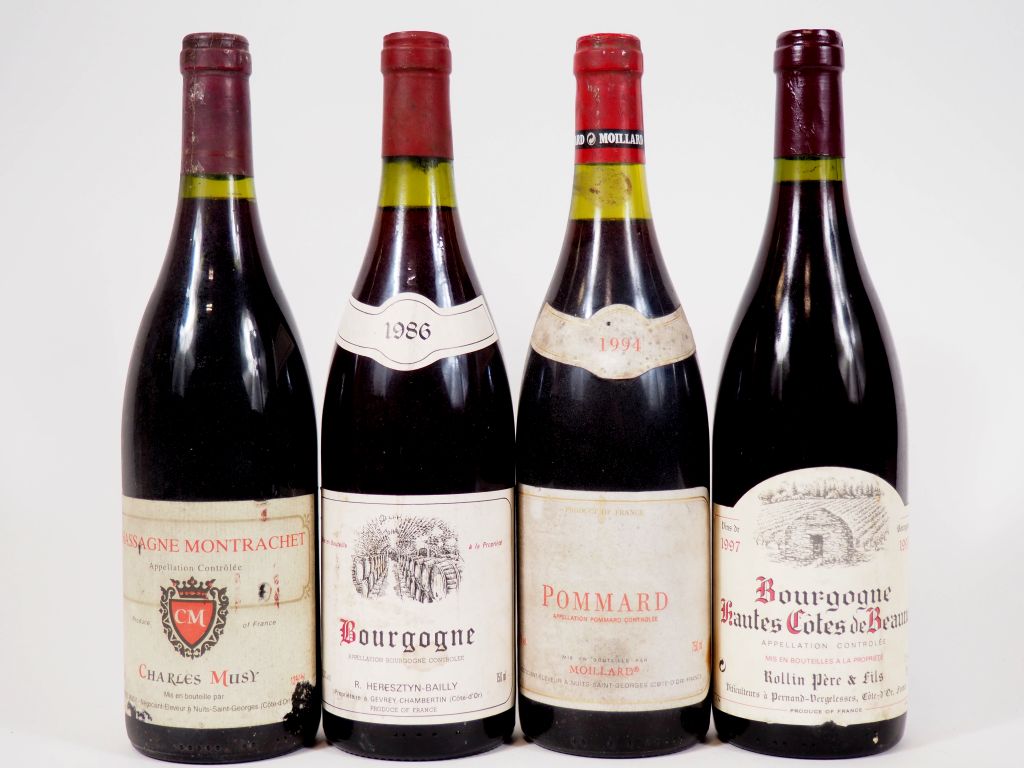 4 BOUTEILLES : 1 CHASSAGNE MONTRACHET CHARLES MUSY NM/CONTRE ETIQUETTE AB - 1 POMMARD MOILLARD 1994 - 1 BOURGOGNE HAUTES COTES DE BEAUNE ROLLIN PÈRE ET FILS 1997 - 1 BOURGOGNE R. HERESZTYN BAILLY 1986