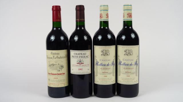 4 BOUTEILLES : 2 CHÂTEAU ROLLAN DE BY CB MEDOC 2000 BG+ - 1 CHÂTEAU PETIT FIGEAC ST EMILION GC 1992 - 1 CHÂTEAU MAGNAN LA GAFFELIERE ST EMILION GC 2003