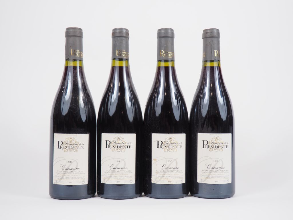 Lot de 4 BOUTEILLES CAIRANNE COTES DU RHÔNE VILLAGES DOMAINE DE LA PRÉSIDENTE au prix de 30 à 40 € en vente aux enchères par l'hôtel des ventes Primardeco