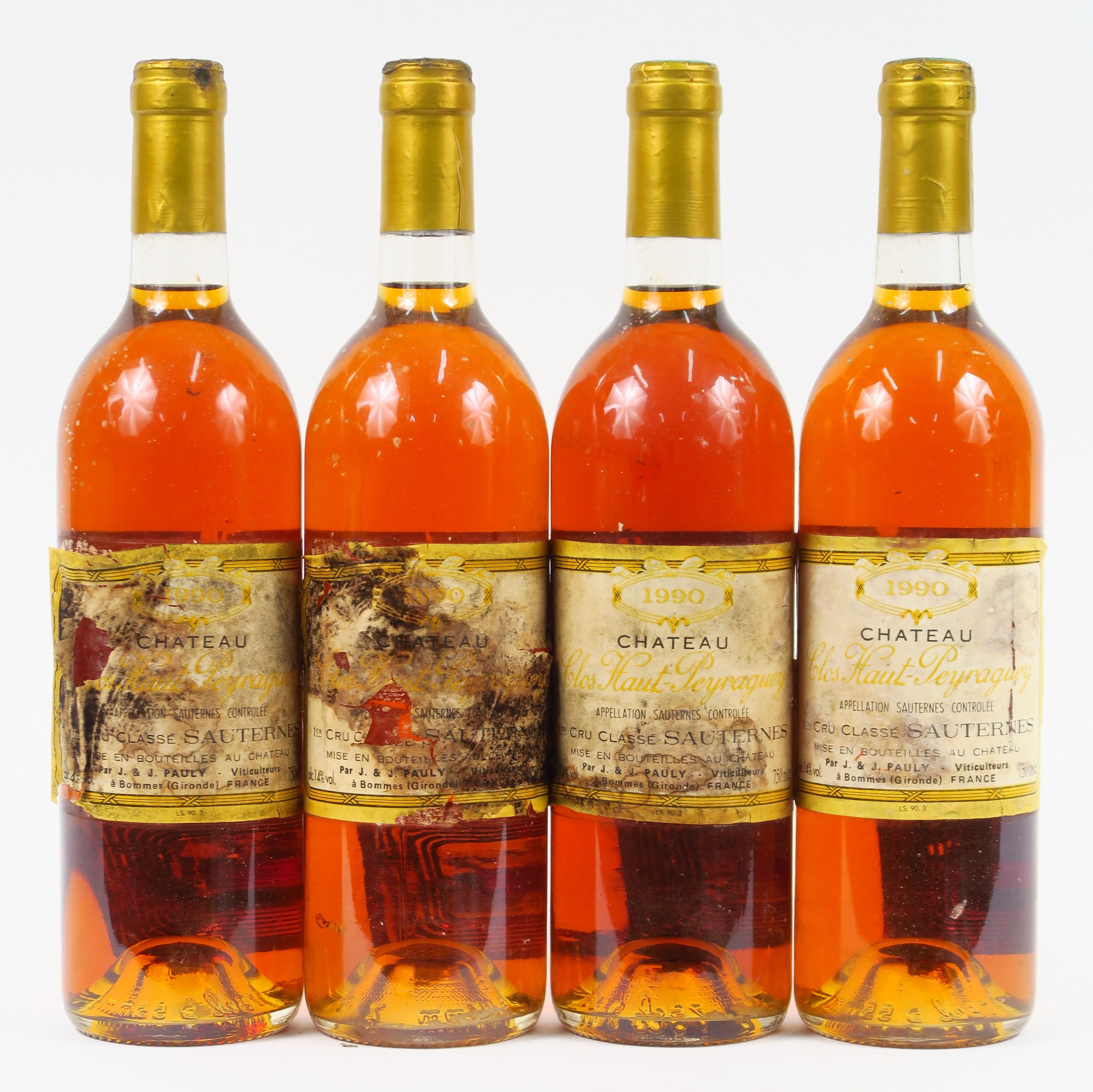 Lot de 4 BOUTEILLES CHÂTEAU CLOS HAUT PEYRAGUEY 1er CC SAUTERNES - 1990 - EA au prix de 100 à 120 € en vente aux enchères par l'hôtel des ventes Primardeco