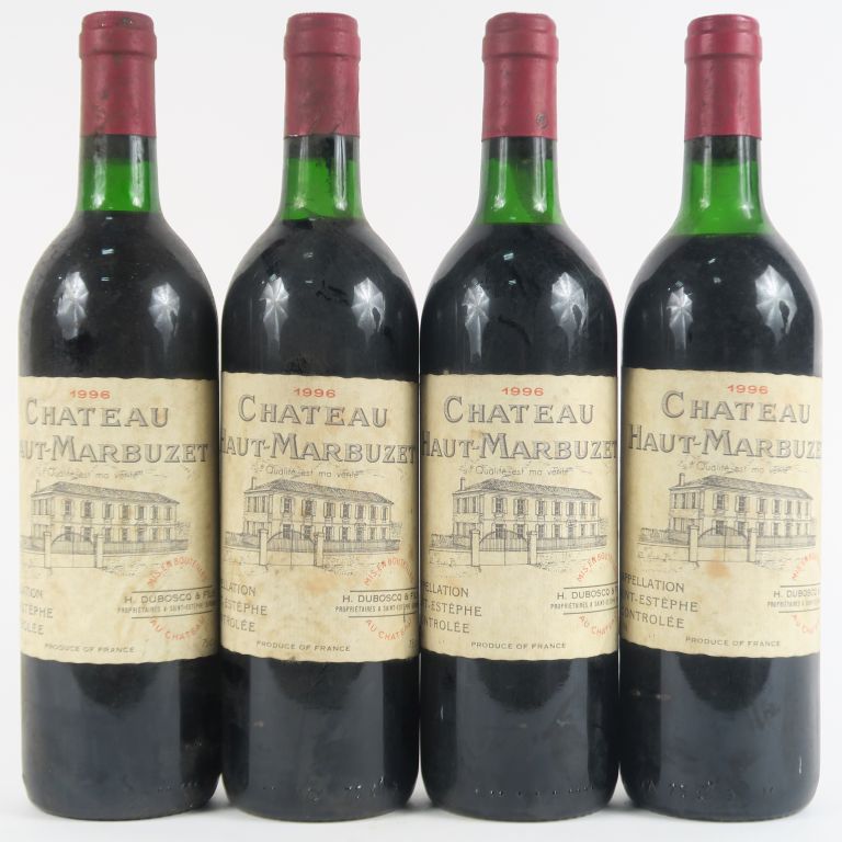 Lot de 4 BOUTEILLES CHÂTEAU HAUT MARBUZET ST ESTEPHE - 1996 - 1 BG/2 LB/1 LB- au prix de 50 à 60 € en vente aux enchères par l'hôtel des ventes Primardeco