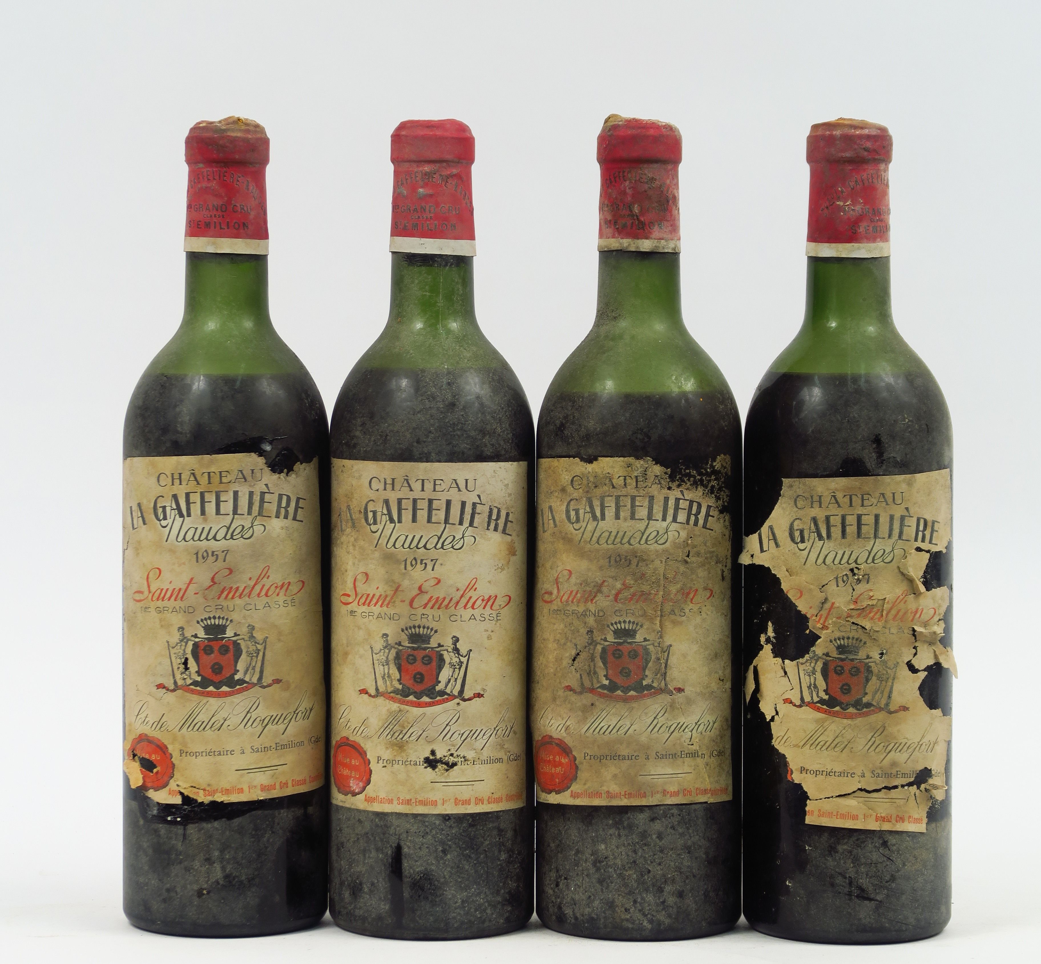 4 BOUTEILLES CHÂTEAU LA GAFFELIERE 1er GCC ST EMILION - 1957 - 1 MEP/3 BEP/BS/EF/3 CAPS CORRODEES/EA