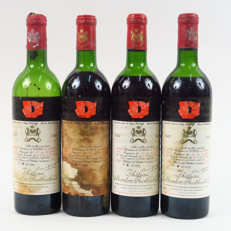 4 BOUTEILLES CHÂTEAU MOUTON ROTHSCHILD 1er GCC PAUILLAC - 1972 - 1 HEP ET/2 MEP-BEP 1 HEP CAPS CORRODEES/1 VIDANGE CAPS AB
