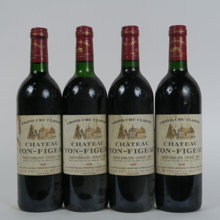 Lot de 4 BOUTEILLES CHÂTEAU YON FIGEAC GCC ST EMILION - 1988 - 1 LB/1 ES/3 EL au prix de 70 à 90 € en vente aux enchères par l'hôtel des ventes Primardeco