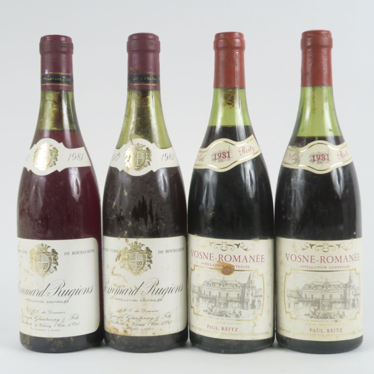 4 BOUTEILLES de 1981 : 2 VOSNE ROMANÉE PAUL REITZ 3,5 CM/4,5 CM -2 POMMARD RUGIENS GLANTENAY 3,5 CM/5,5 CM