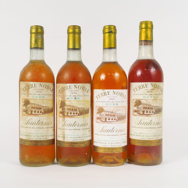 Lot de 4 BOUTEILLES TERRE NOBLE SAUTERNES : 1 de 1976 - 2 de 1978 - 1 de 1982 au prix de 40 à 50 € en vente aux enchères par l'hôtel des ventes Primardeco