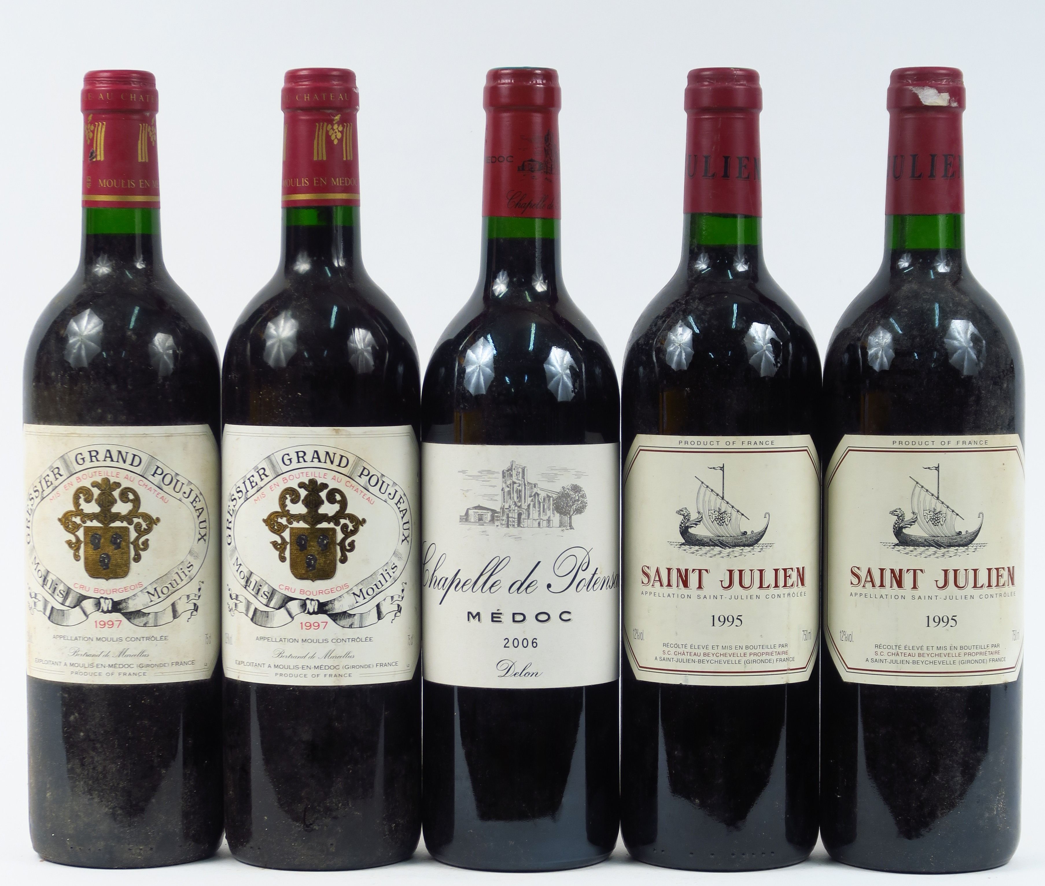 5 BOUTEILLES : 2 GRESSIER GRAND POUJEAUX MOULIS 1997 - 2 ST JULIEN DE BEYCHEVELLE 1995 - 1 BOUTEILLE LA CHAPELLE DE POTENSAC MEDOC 2006