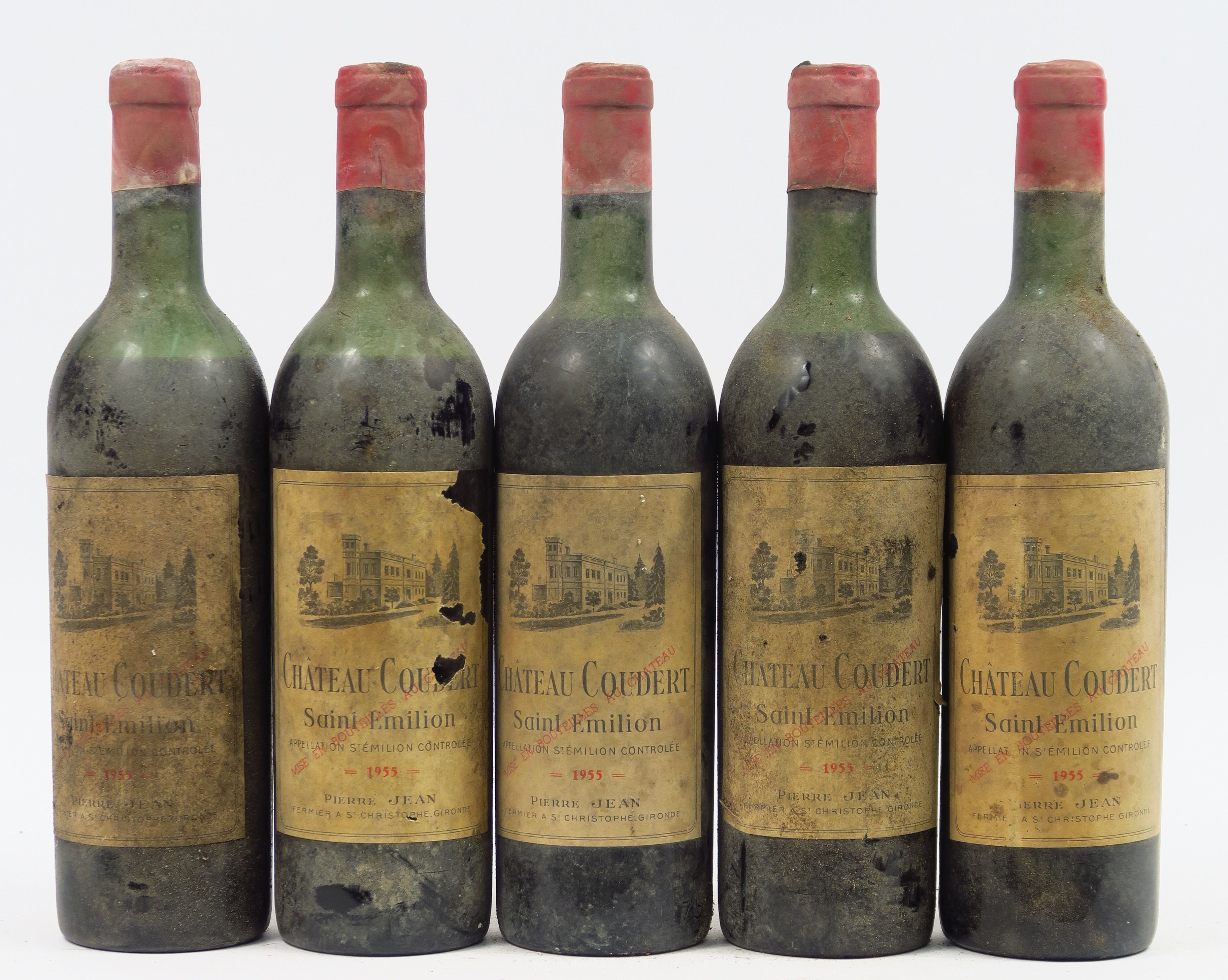 5 BOUTEILLES CHÂTEAU COUDERT ST EMILION 1955 - 2 HEP/1 MEP/1 BEP/3 CAPS AB/5 CAPS CORRODEES/BS/EA