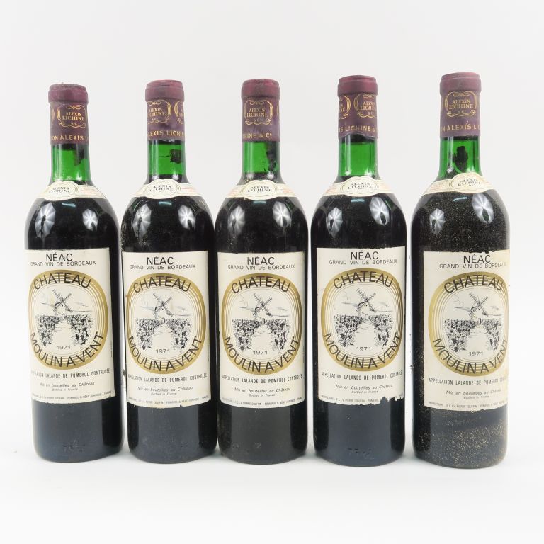 Lot de 5 BOUTEILLES CHÂTEAU MOULIN A VENT LALANDE DE POMEROL - 1971 - BG au prix de 70 à 80 € en vente aux enchères par l'hôtel des ventes Primardeco