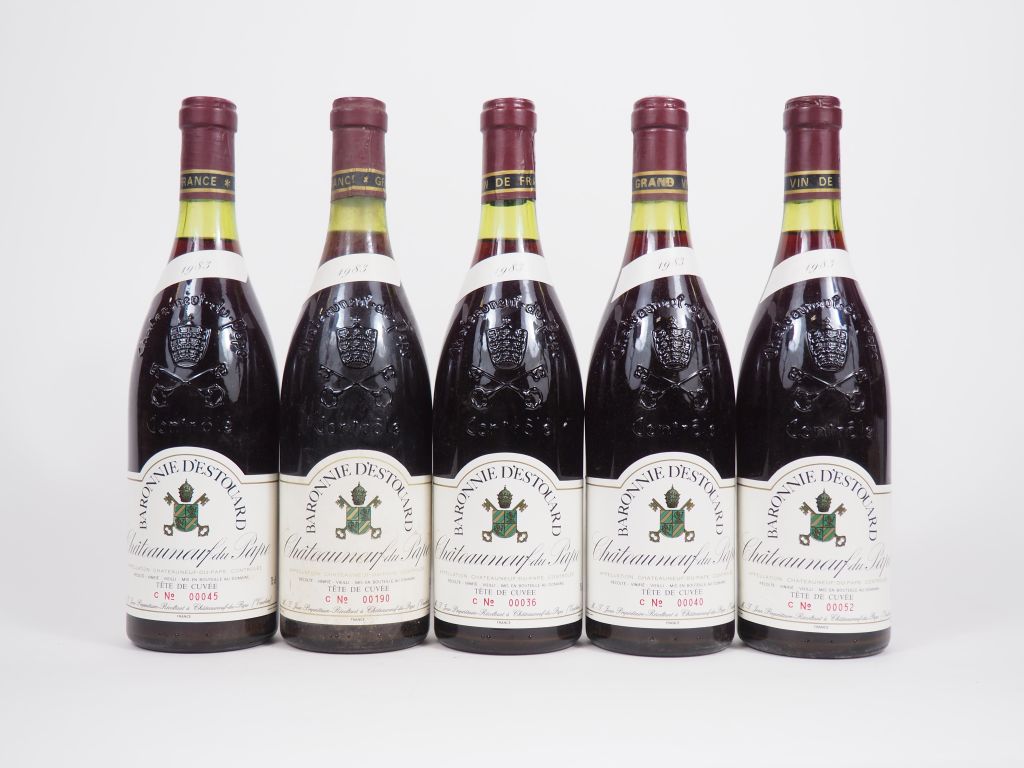 Lot de 5 BOUTEILLES CHÂTEAUNEUF DU PAPE BARONNE D'ESTOUARD - 1983 au prix de 50 à 60 € en vente aux enchères par l'hôtel des ventes Primardeco