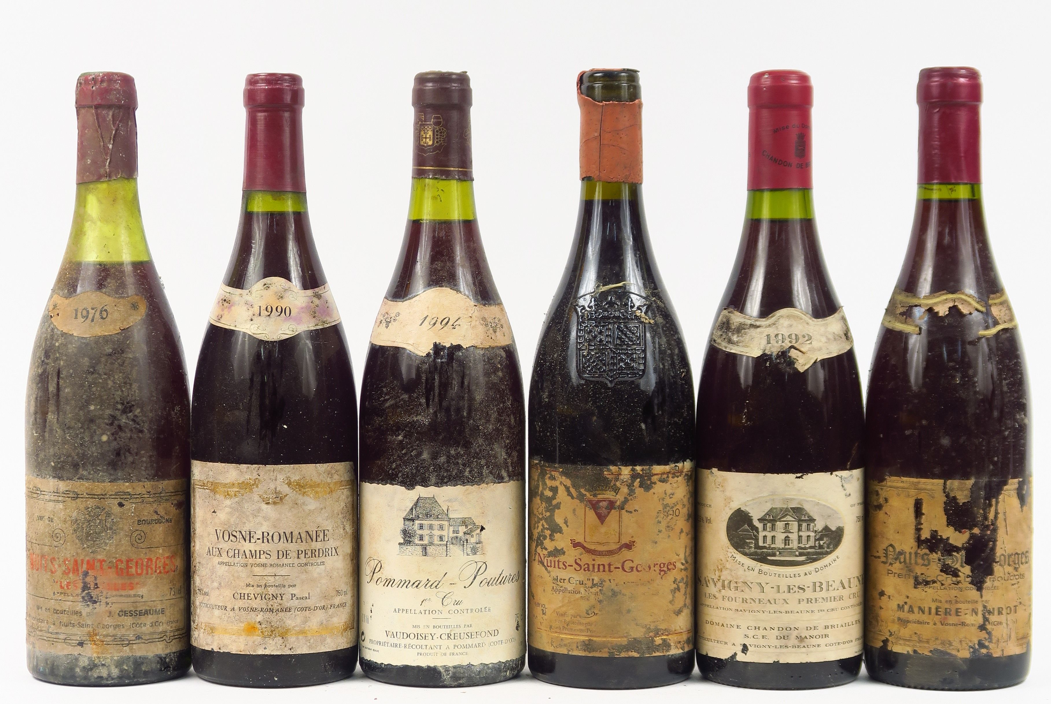 6 BOUTEILLES : 1 POMMARD POUTURES 1er CRU VAUDOISEY CREUSEFOND 1994 ELA - 1 NUITS ST GEORGES GESSEAUME 1976 4,5 CM/EA/CAPS AB - 1 NUITS ST GEORGES 1er CRU 'LES VAUCRAINS' 1990 EA/CAPS CIRE AB - 1 BOUTEILLE VOSNE ROMANEE 1er CRU 'AUX CHAMPS DE PERDRIX' P.