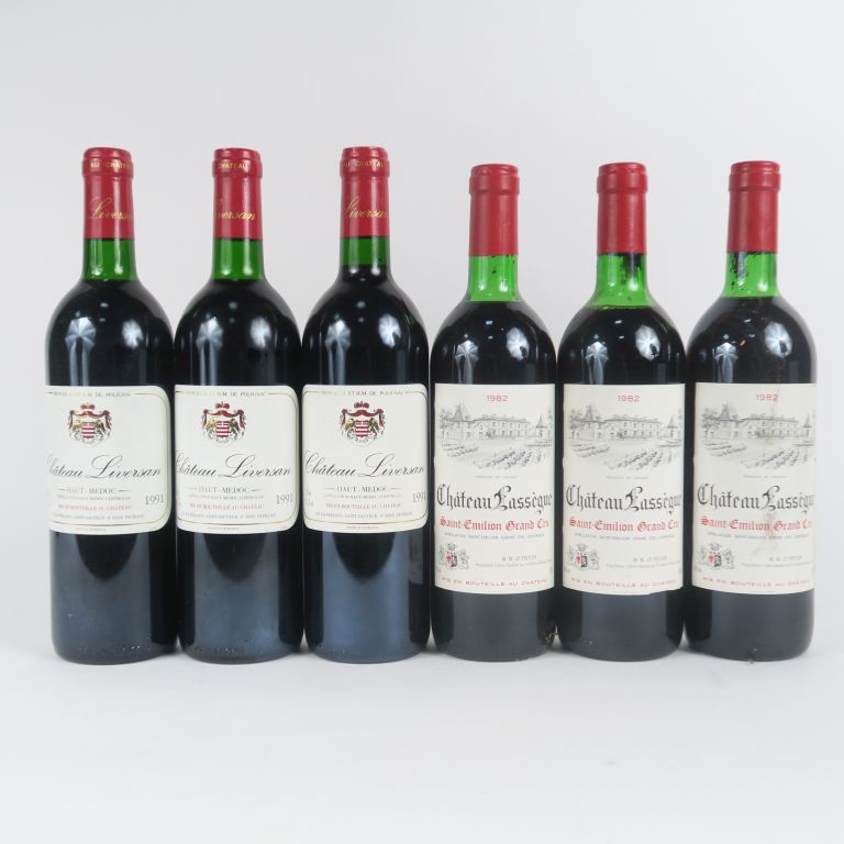 6 BOUTEILLES : 3 CHÂTEAU LASSEGUE ST EMILION GC 1982 2 LB/1 HEP - 3 CHÂTEAU LIVERSAN HAUT MEDOC 1991