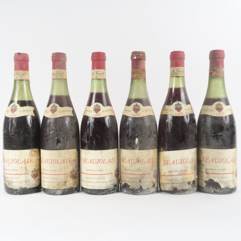 6 BOUTEILLES BEAUJOLAIS CHARLES VIENOT - 1966 - NIVEAUX DE 3 CM à 4,5 CM/BS/ETA