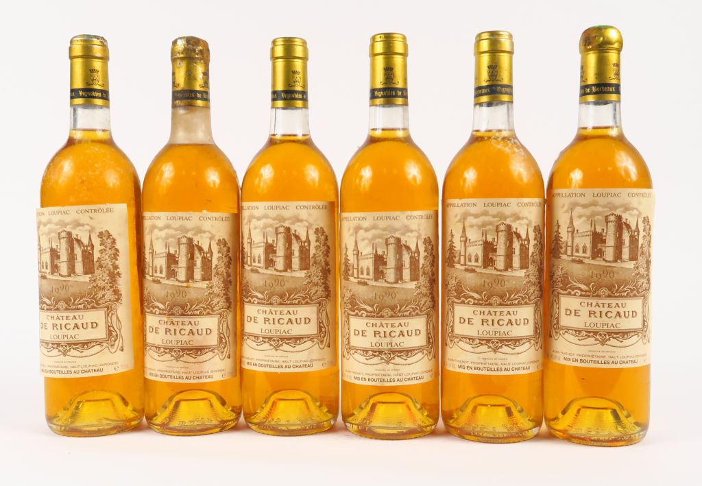 Lot de 6 BOUTEILLES CHÂTEAU DE RICAUD LOUPIAC - 1990 - 5 BG/1 LB au prix de 60 à 70 € en vente aux enchères par l'hôtel des ventes Primardeco