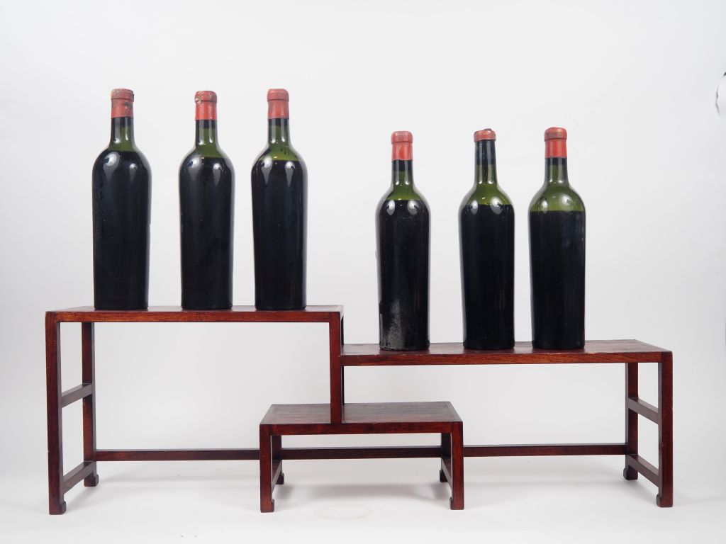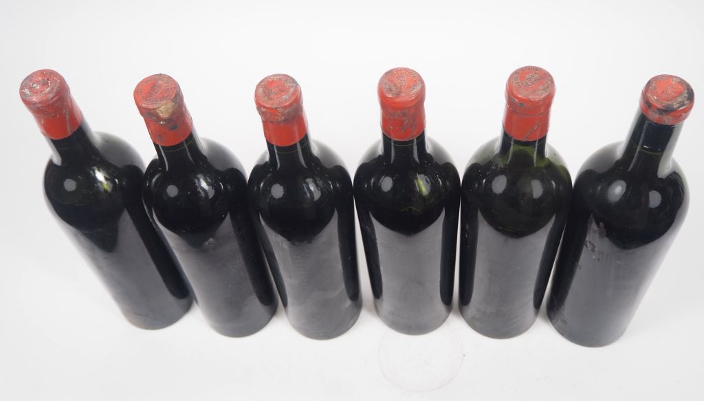 6 BOUTEILLES CHÂTEAU LARROQUE HAUT ST ÉMILION - 1911 - 1 HEP/1 MEP-BEP/2 BEP/2 VIDANGES/BOUCHONS ÉTAMPÉS/1 CAPSULE DÉCOUPÉE/1 COULEUSE