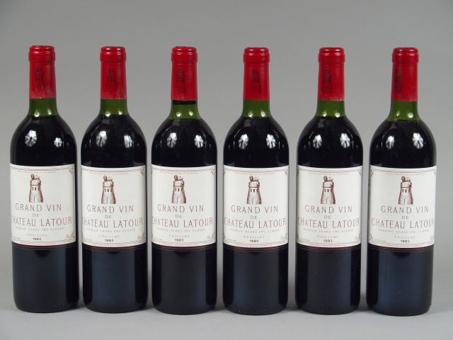 Lot de 6 BOUTEILLES CHÂTEAU LATOUR 1er GCC PAUILLAC - 1983 - 4 BG/2 LB au prix de 1200 à 1300 € en vente aux enchères par l'hôtel des ventes Primardeco