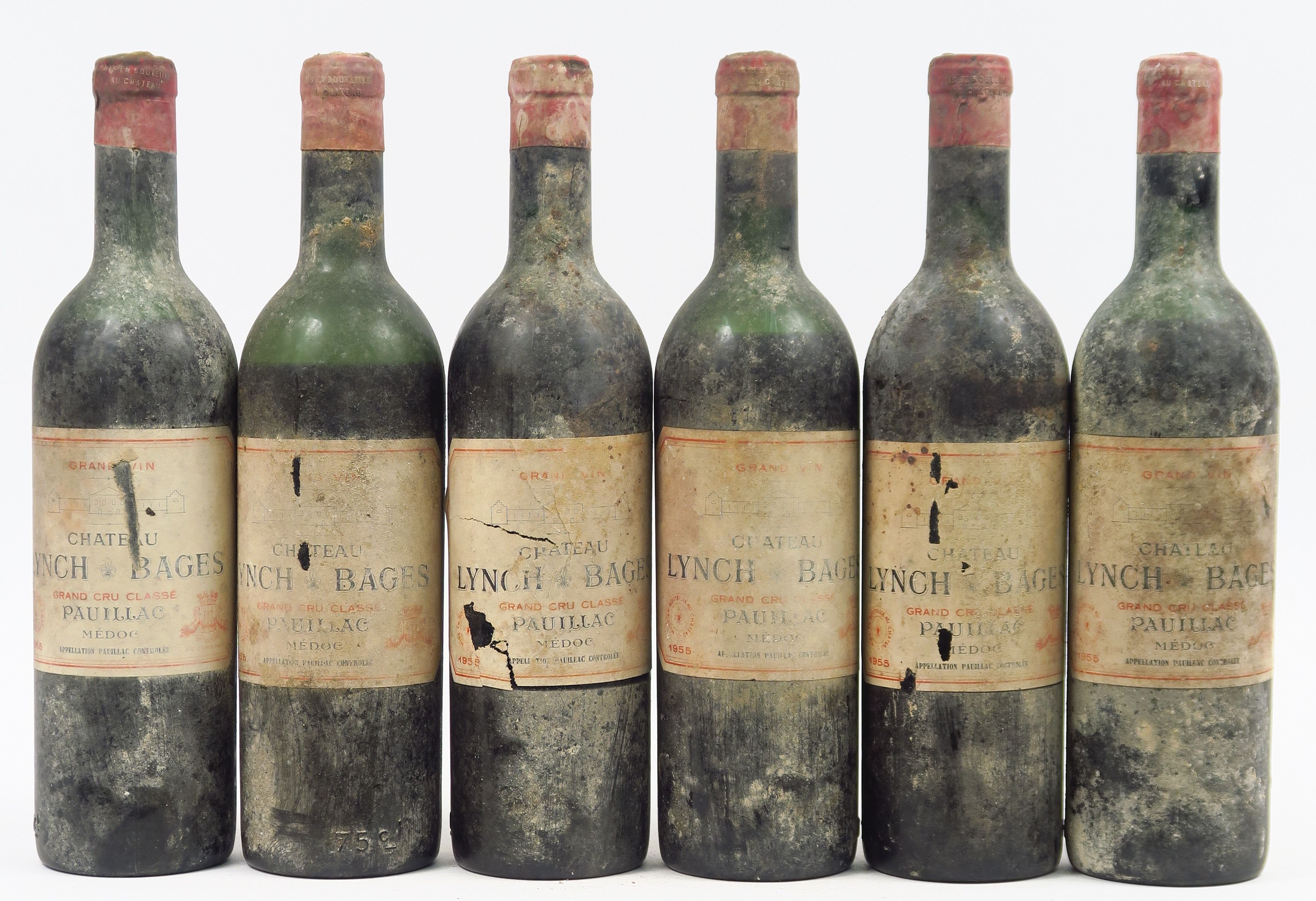 6 BOUTEILLES CHÂTEAU LYNCH BAGES GCC PAUILLAC - 1955 - 2 HEP-MEP/4 BEP/EA/4 CAPS T CORRODEES/1 CAPS L CORRODEE/1 CAPS AB