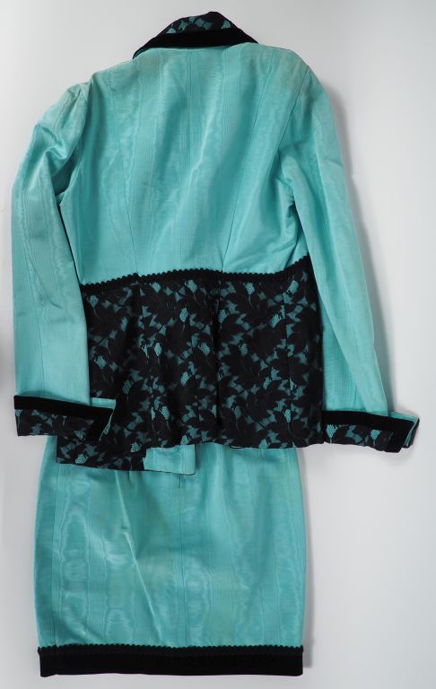 ALIMIA, Paris - Genève, Ensemble de tailleur, veste et jupe, vert d'eau et noir agrémenté de dentelle. Veste à col ouvrant par cinq boutons. Jupe courte, fermeture à l'arrière par zip et bouton. Taille présumée. 36/38 (tâches, manque l'étiquette de la jupe)