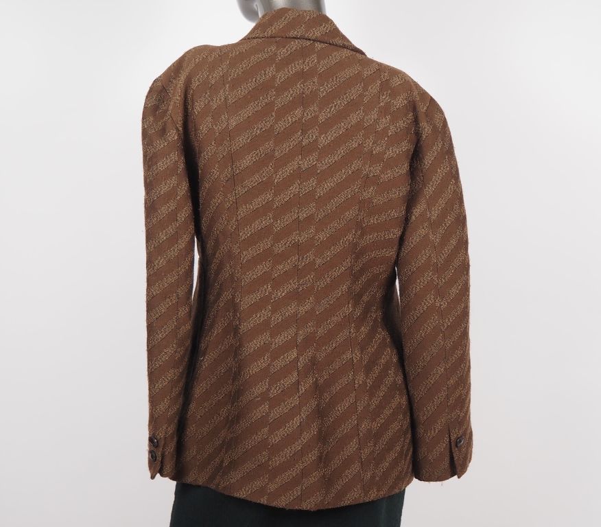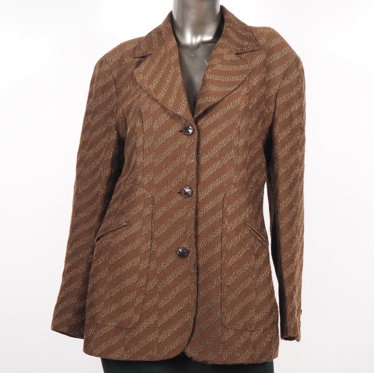 BAZAR de Christian LACROIX Veste rayée en acetate, laine (15%) et acrylique dans les tons marrons. Trois boutons et deeux poches plaquées à l'avant. Deux boutons sur les manches. Taille. 42 (manque un bouton sur une manche)