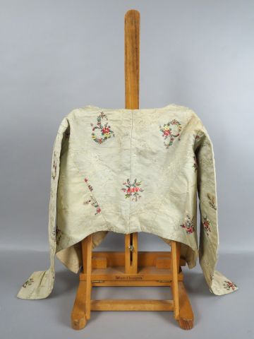 Beau document, corsage baleiné Louis XVI soie armure cannelée vert amande brochée, à décor de bouquets de fleurs polychromes posés en semis. Utilisation de fil ondé dans les nœuds des bouquets. Doublure en lin cousu main coupe en V dans le dos . Décolleté bateau. Manches à la forme, poignets boutonnés. Fraicheur des coloris. Décoloration sous les bras, tâches de rouille. (9)