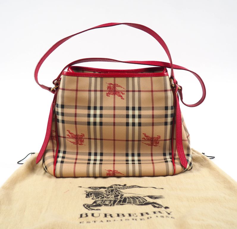 BURBERRY Sac porté épaule en toile enduite tartan. Deux anses, lanières et bordures rouges. Fermeture par bouton pression découvrant un coompartiment central avec une pochette amovible à pressions et fermeture zippée. Signé. 26 x 26 x 15 cm Avec son dustbag.