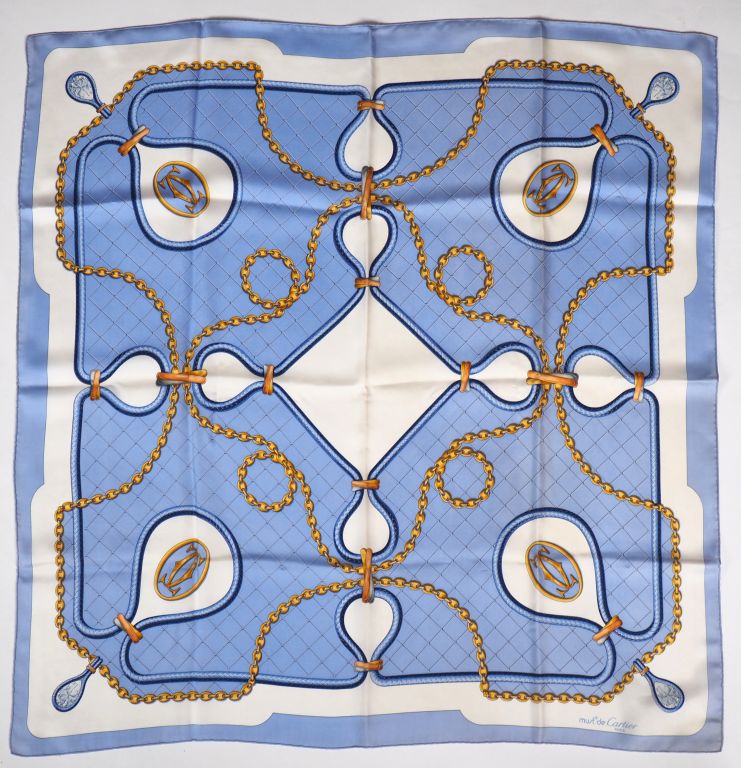 CARTIER, Must Foulard probablement en soie, à dominante bleu et or sur fond blanc. Signé.