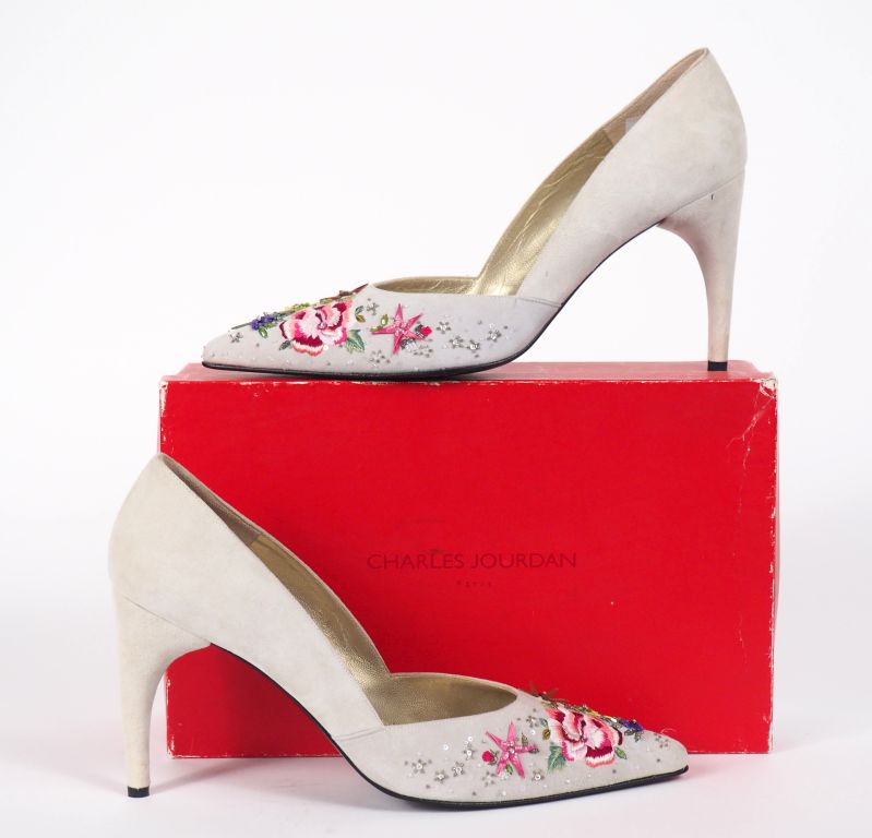 Charles JOURDAN, Paris Paire d'escarpins en daim gris clair, à décor de fleurs brodées agrémentées de perles et sequins. Modèle Juliette 1. Taille. 9 1/2 Dans leur boite. (très légers manques)