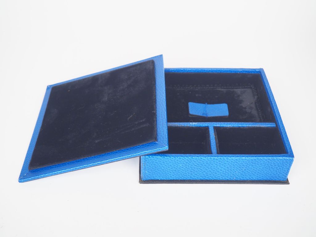 Christian DIOR. Boite à bijoux de forme carrée en cuir bleu. Intérieur en velours noir. Prise du couvercle en métal doré. Signée. Dim. 17 x 17 cm. (petites usures)
