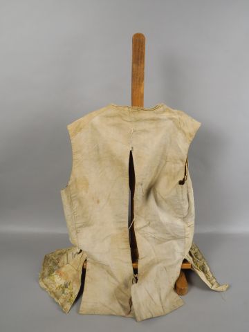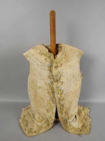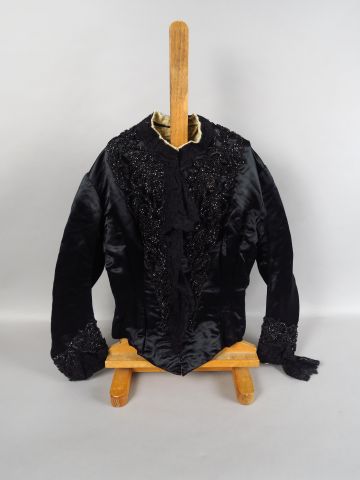 Document: gilet Louis XVI en soie beige brodée de bouquets au passé plat et passé empiétant de fils de soie polychromes.5 boutons recouvert de même mauvais état (16) Corsage baleiné "maison Vignon 182 Rue de Rivoli à Paris" fin XIXème siècle. satin de soie noir, ruban brodé de tubes de verre noir imitant le jais. sur les parements soie fusée sous les bras (18)