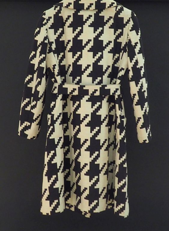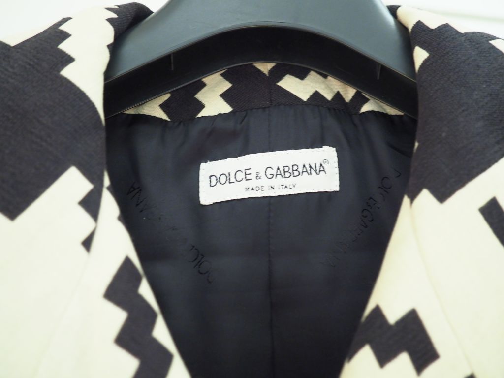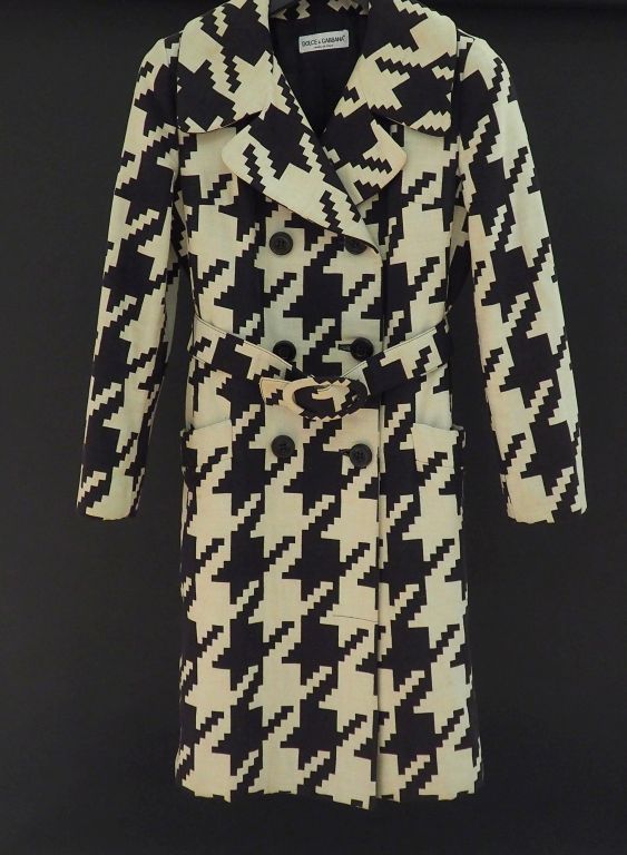 DOLCE GABBANA Manteau croisé à motifs géométrique noirs et blancs. Modèle à ceinture, deux poches plaquées. Taille. 42 (étiquette donnant la composition effacée, un fil tiré, tissu recouvrant la boucle de ceinture légèrement usé)