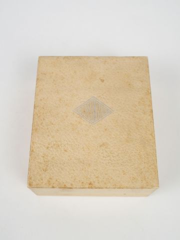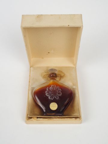 D’ORSAY. R. Lalique « Fleur Aster », 1913 Flacon en verre blanc soufflé moulé à patine bleue de René Lalique, présenté dans son coffret pour le parfum « Chevalier ». Flacon et bouchon décorés à l’identique, numérotés. Intérieur du coffret en satin (traces de parfum à l’endroit du bouchon). Dessus du coffret grainé blanc titré « d’Orsay ». Réf Marcilhac p. 955 Ht 9,4 cm