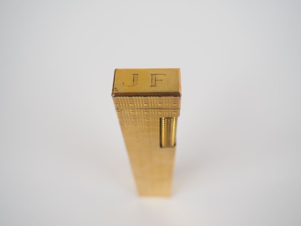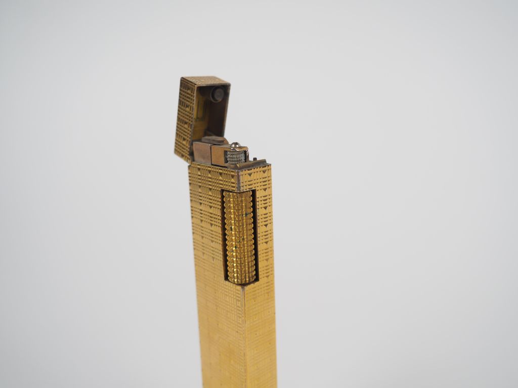 DUNHILL Important briquet de forme rectangulaire en métal doré, à décor géométrique. H. 12,5 cm