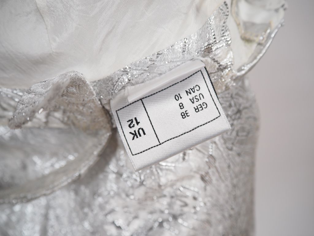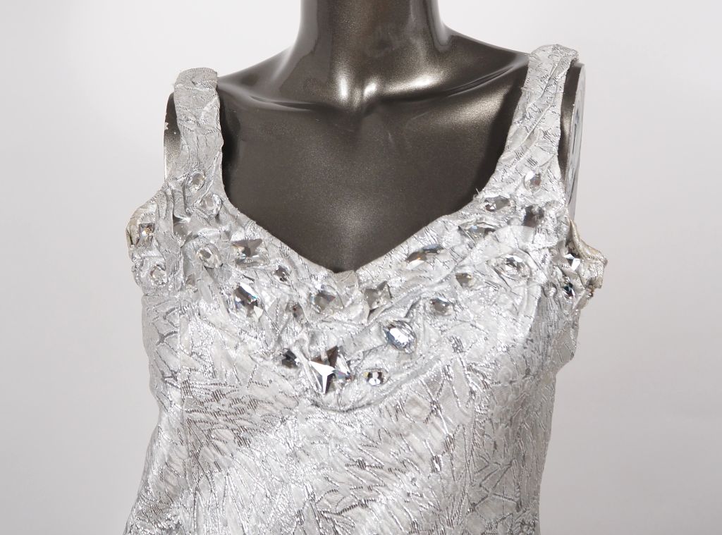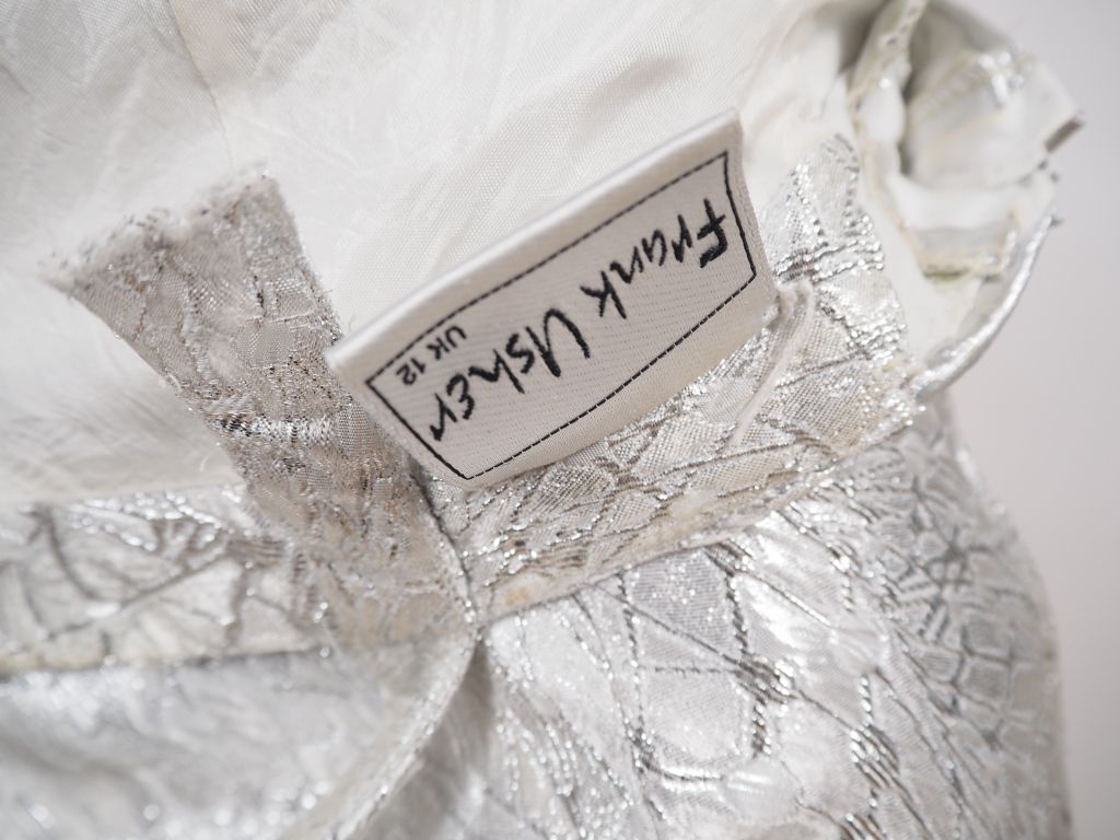 Franck USHER Robe de soirée à fine bretelle et traine en tissu à rehauts argentés. Des strasses agrémentent le haut de la robe. Taille UK. 12