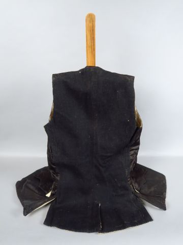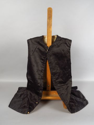 Gilet XVIIIème siècle soie façonnée reteinte en noir pour un deuil ? décès de Louis XVI ? 13 boutons en pareil don’t 6 ont le bois apparent Le dos est en laine rude et gratteuse dite Revêche. Etat d’usage quelques trous de mites, tâches de rouille sur la doublure. (17)