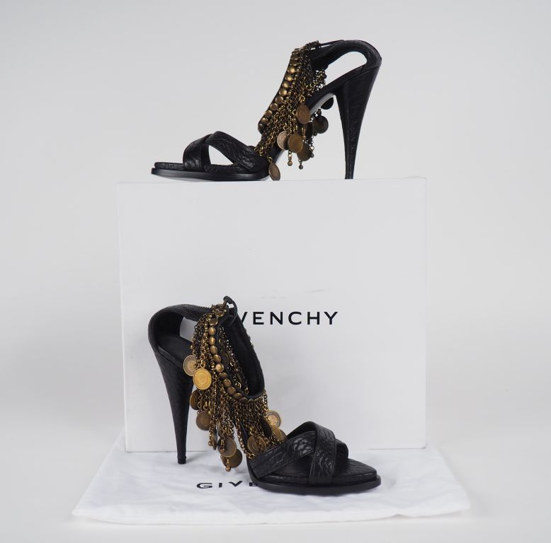 GIVENCHY Paire de sandale à brides et talons aiguilles. Attache à la cheville agrémentée de chainettes et pastilles en métal en pendeloque. Taille. 41 Etat neuf. Avec leurs housses et leur boite.