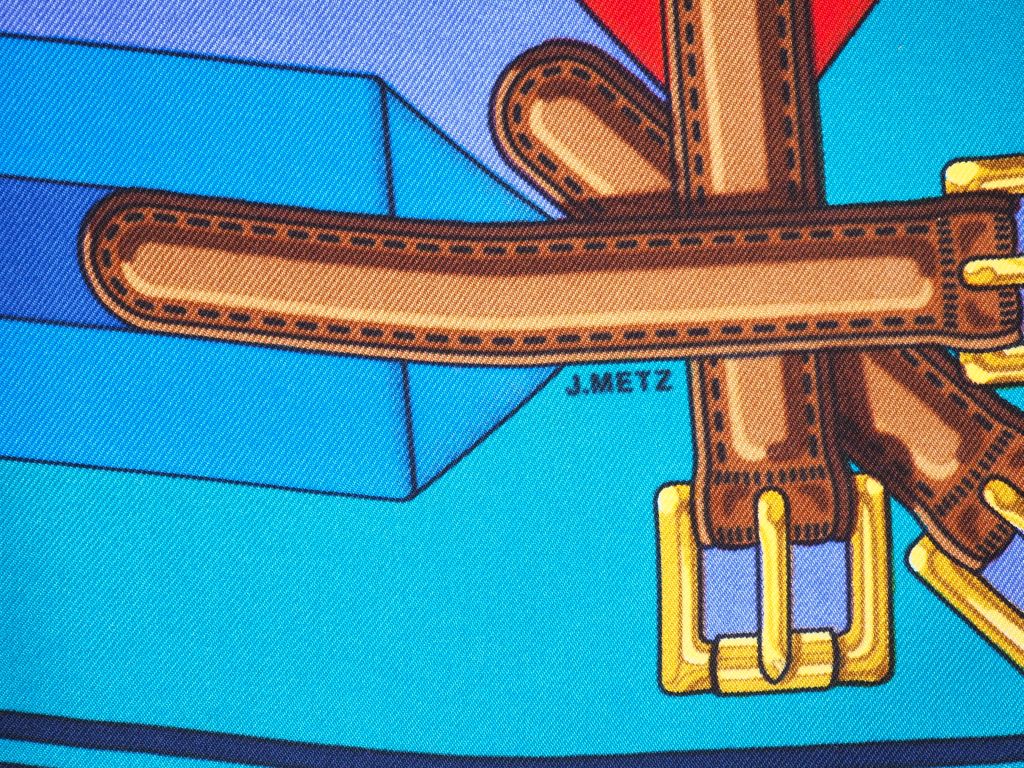 HERMES, Paris Carré en soie polychrome, modèle "Les sangles". Dessin par J. Metz. Signé. Dans sa boite (petite tâches)