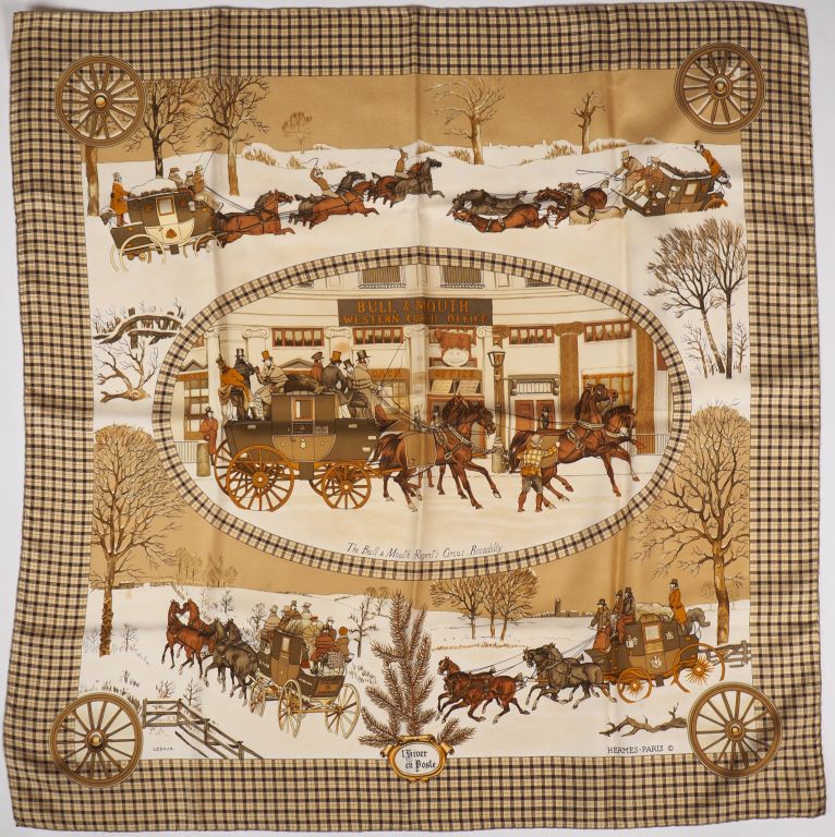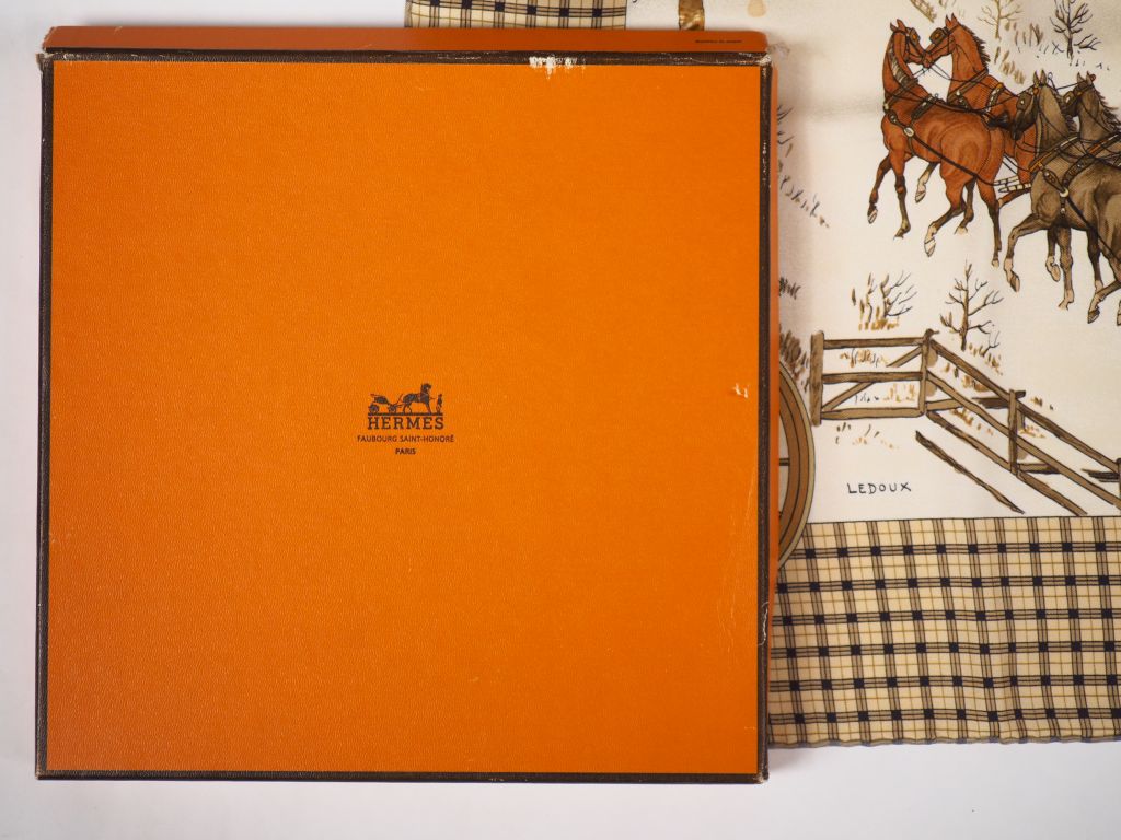 HERMES, Paris Carré en soie polychrome, modèle "L'hiver en poste". Dessin de Ledoux. Signé. Dans sa boite (usée) (petites taches)
