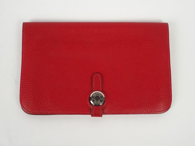 HERMES. Portefeuille modèle DOGON en veau Togo rouge, fermeture à patte cuir et fermoir clou de selle en métal argenté. 12 x 19,5 cm