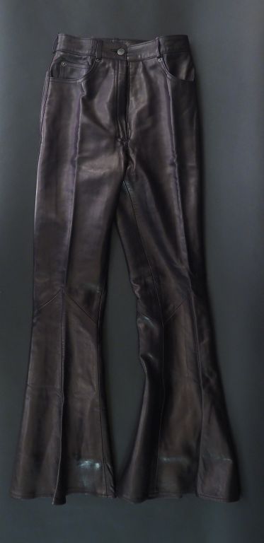 Jean-Claude JITROIS Pantalon évasé en cuir noir. Cinq poches. Braguette et bouton à l’avant. Taille 38.