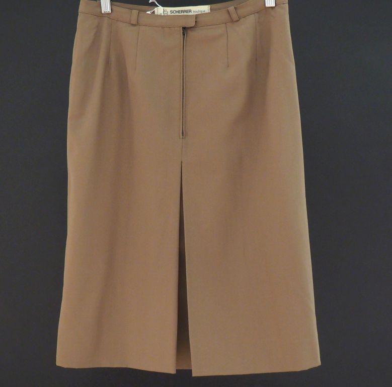 Jean-Louis SCHERRER, boutique Ensemble de tailleur en laine (100%) kaki, comprenant : - une chemise à manches longues. Fermetures par des boutons. Deux poches à rabat et bouton à l'avant. - une jupe et sa ceinture. Agrémentée à l'avant d'un pli. Fermeture par zip. Pas d'indication de taille, doit correspondre à un 40 (minimum).