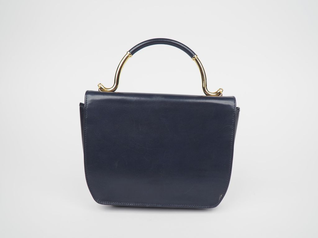 KARL LAGERFELD Sac à main en cuir bleu marine. Fermeture à rabat et bouton pression découvrant un compartiment central à une poche à zip. Une anse en métal doré gainée de cuir. Ornements en métal doré. Signé. 17 x 20,5 x 5 cm Avec son dustbag et sa carte d'authenticité.