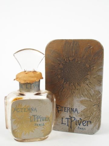 L.T. PIVER Aeterna Flacon en verre avec son étiquette sur une face doré gaufrée, étiquette bandeau autour du col. Présenté dans son coffret or et argent à décor gaufré. Ht 9,5 cm