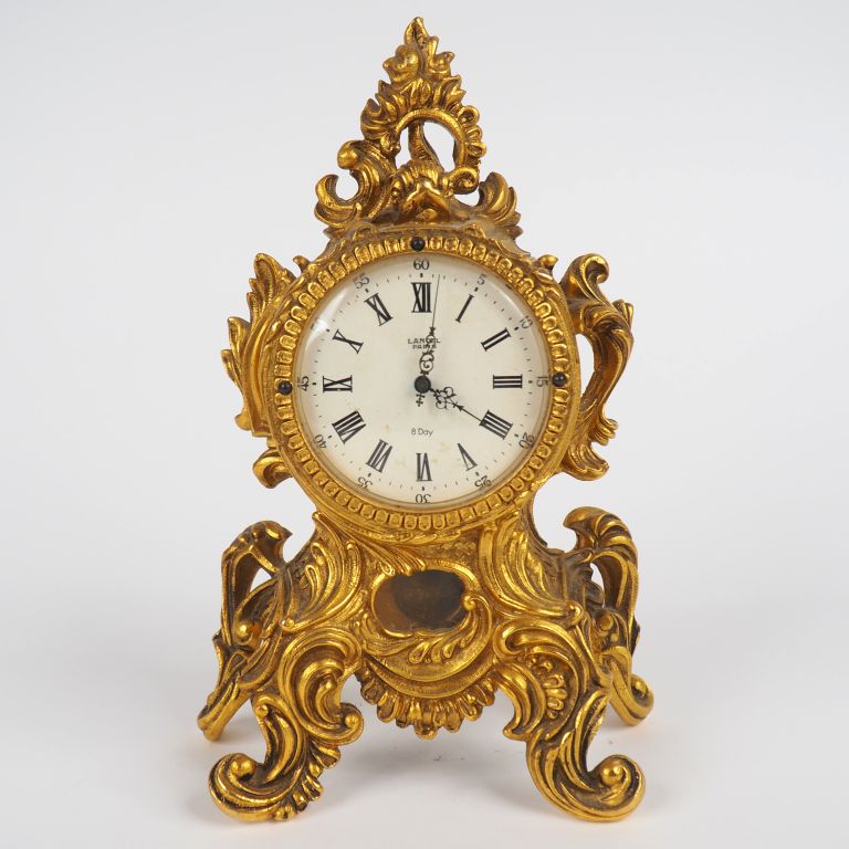 LANCEL, Paris Pendulette de style Louis XV en métal doré. Cadran rond à chiffres romains pour les heures et arabes pour les minutes. Signée. H. 20 cm